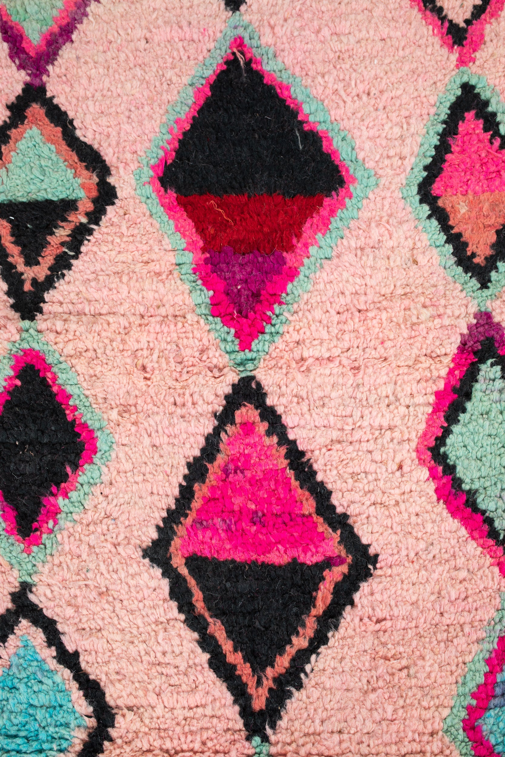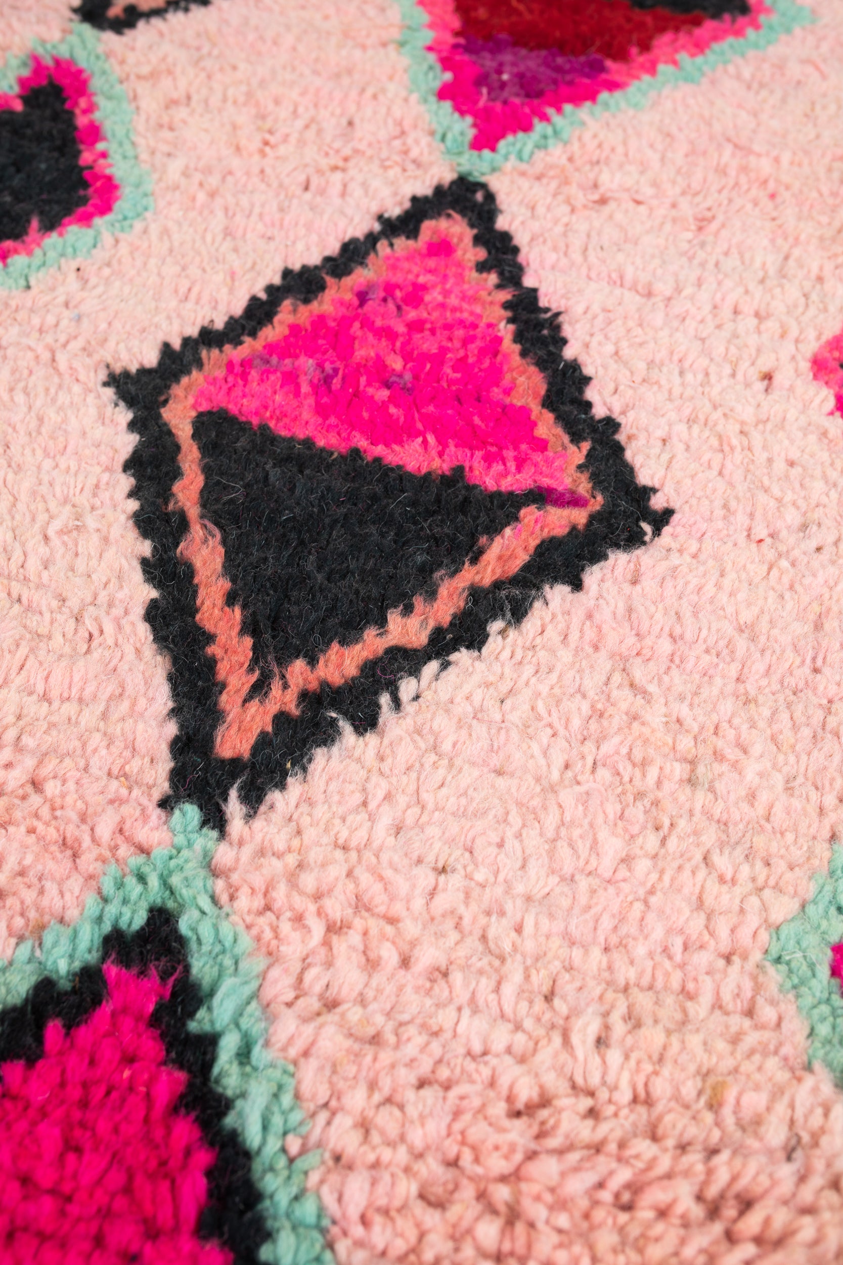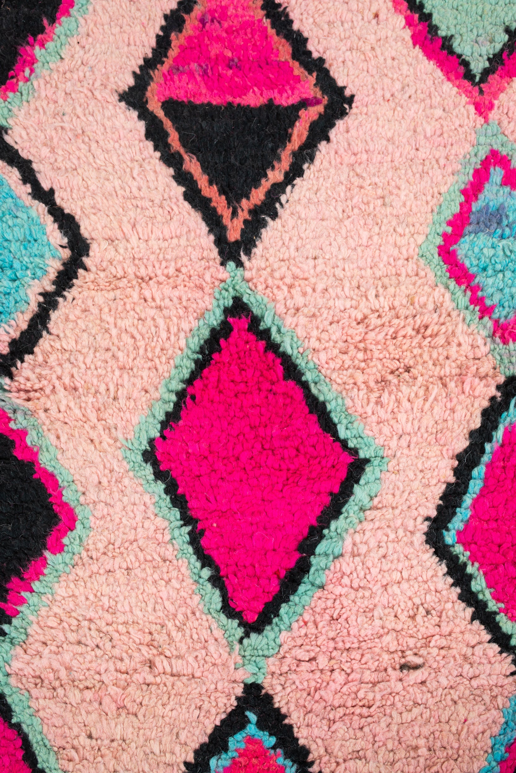 Boujaad rugs often have patterns of small geometric shapes and stars. These soft yet striking pieces are produced with soft wool using mostly natural food with dyes, henna and indigo. Colours are often - pinks, red, purples and oranges. Each rug is individually handcrafted and maybe slightly asymmetrical in their shape and pattern with some minor imperfections.