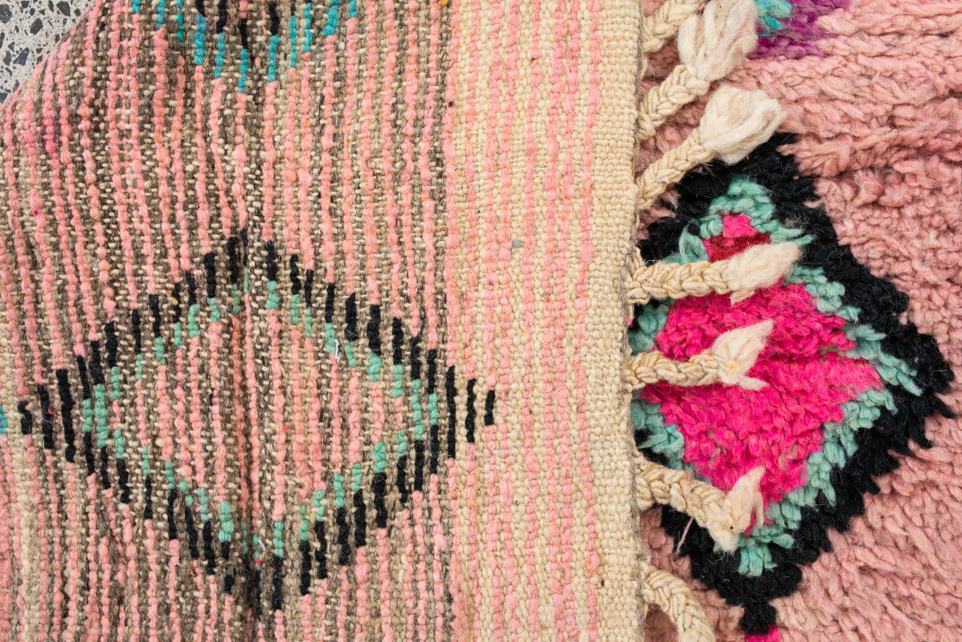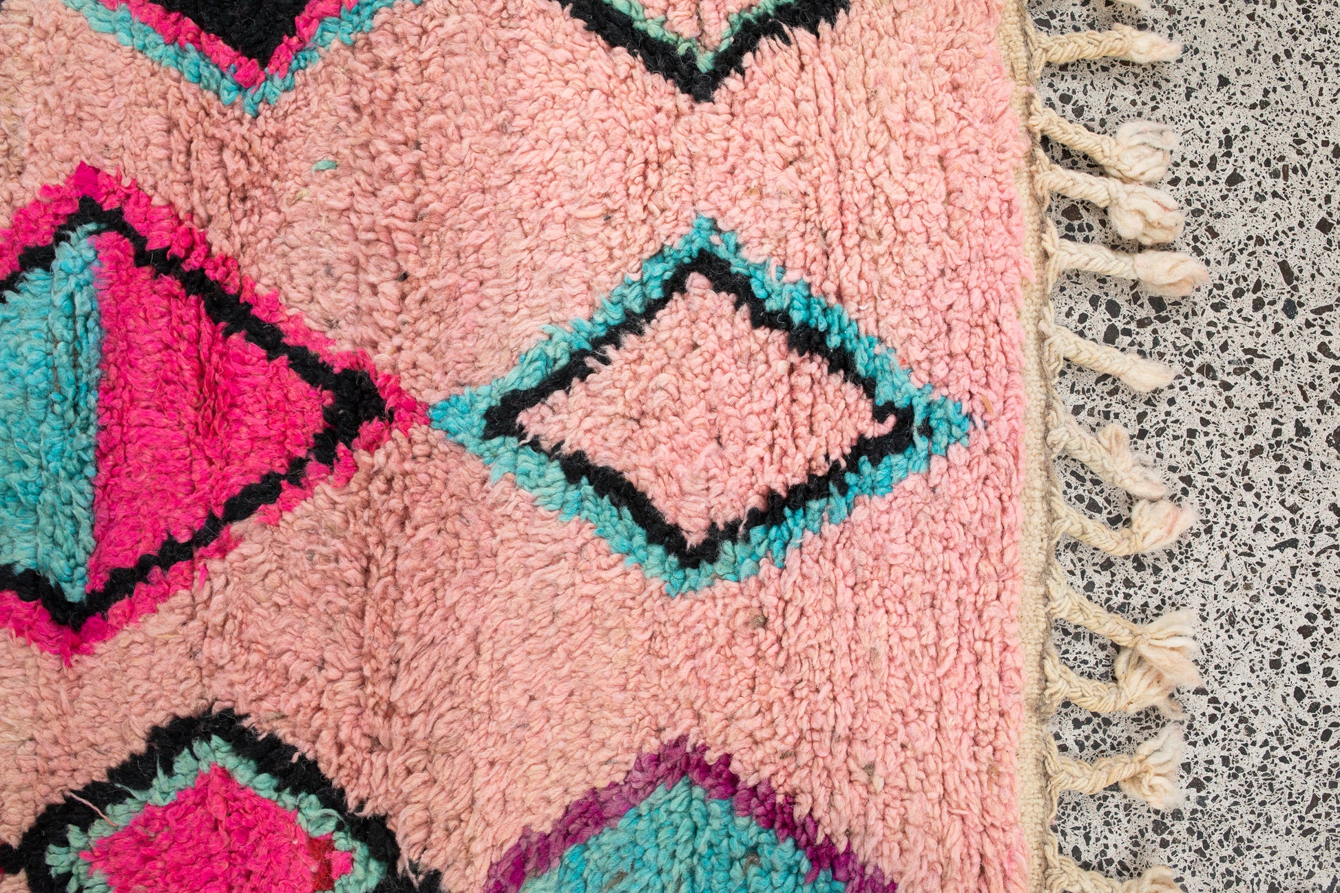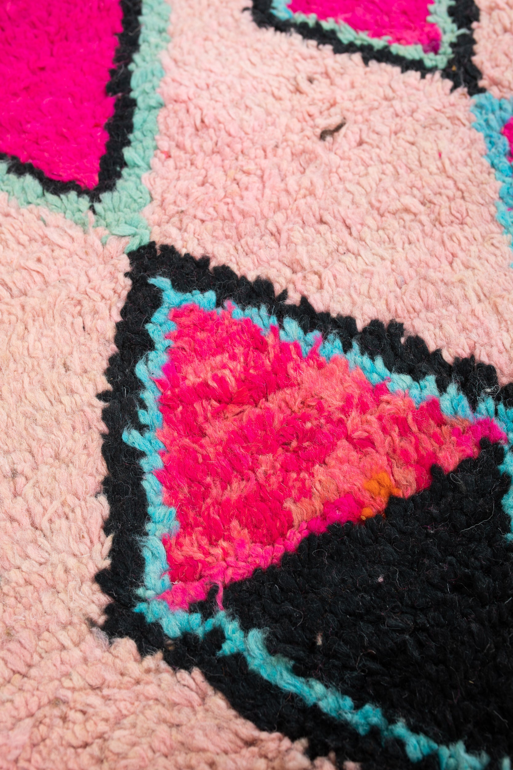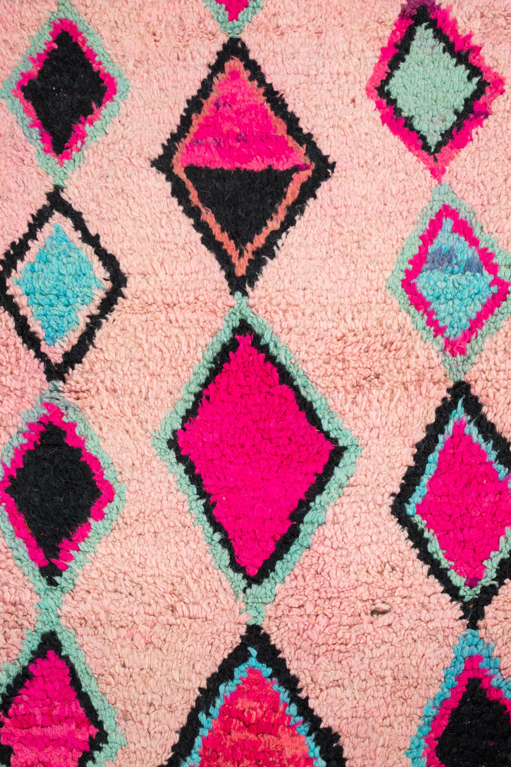 Boujaad rugs often have patterns of small geometric shapes and stars. These soft yet striking pieces are produced with soft wool using mostly natural food with dyes, henna and indigo. Colours are often - pinks, red, purples and oranges. Each rug is individually handcrafted and maybe slightly asymmetrical in their shape and pattern with some minor imperfections.