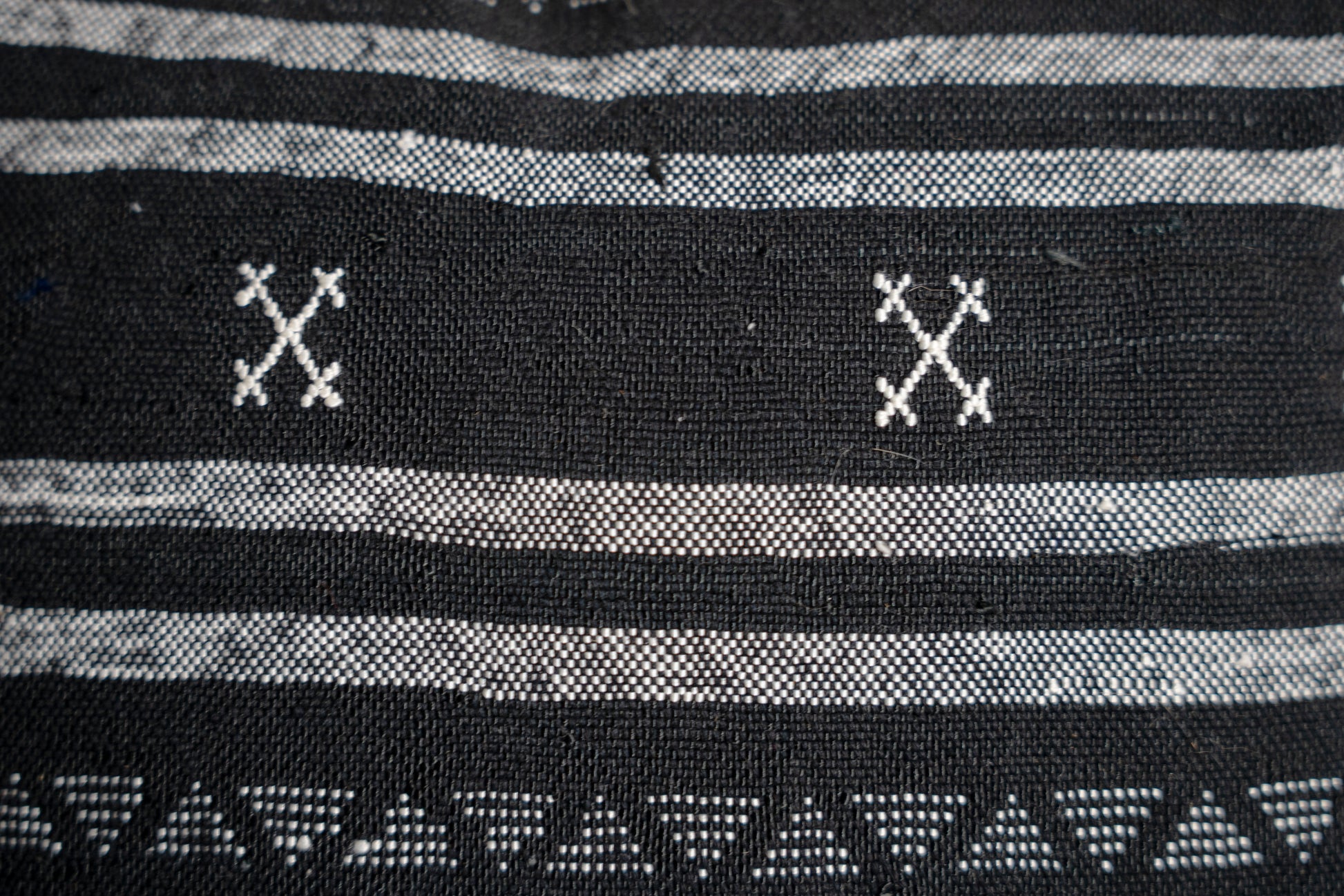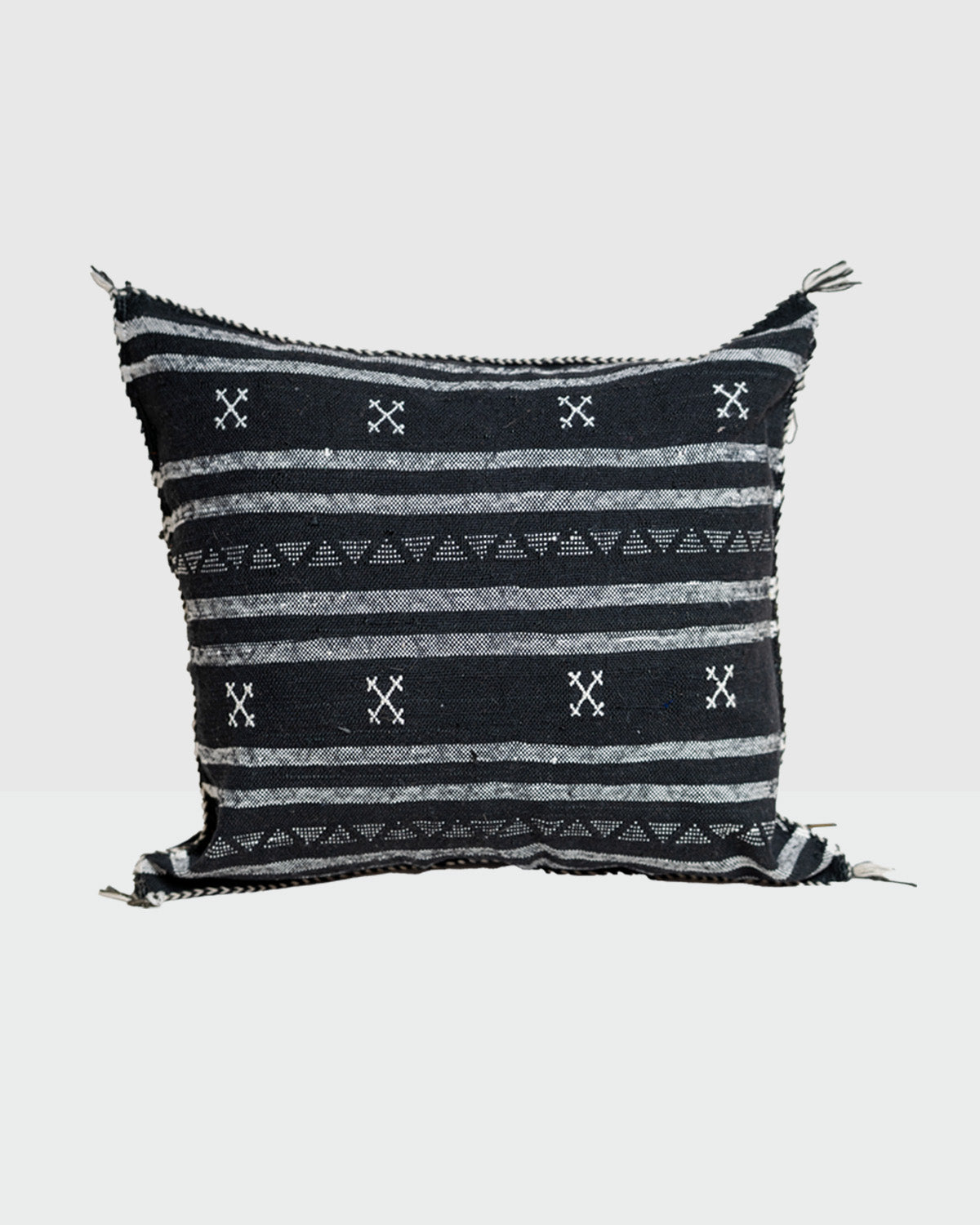 This beautiful cushion features a bold, handcrafted design with a black base and intricate white tribal-style patterns, handmade in the souks of Marrakech.