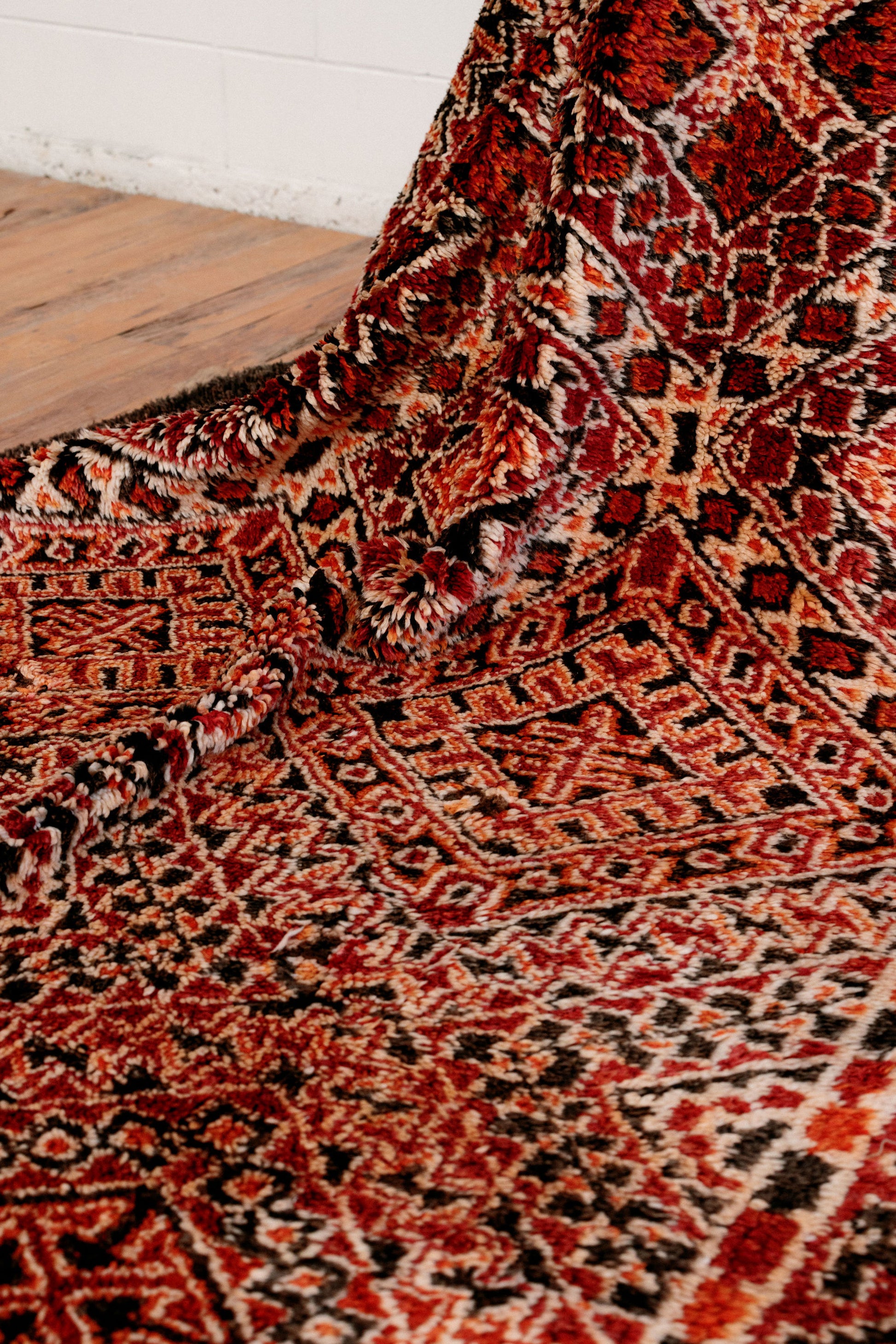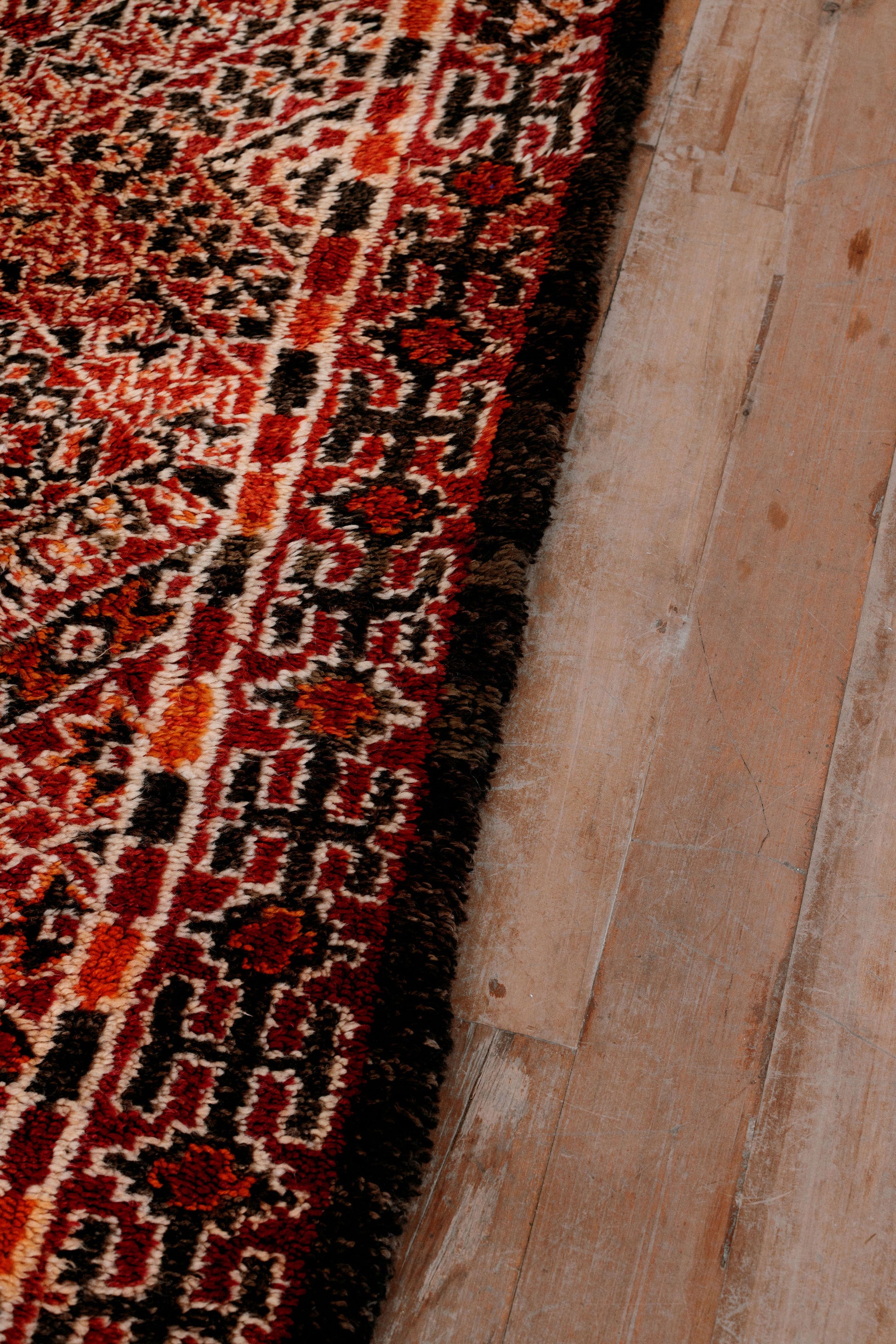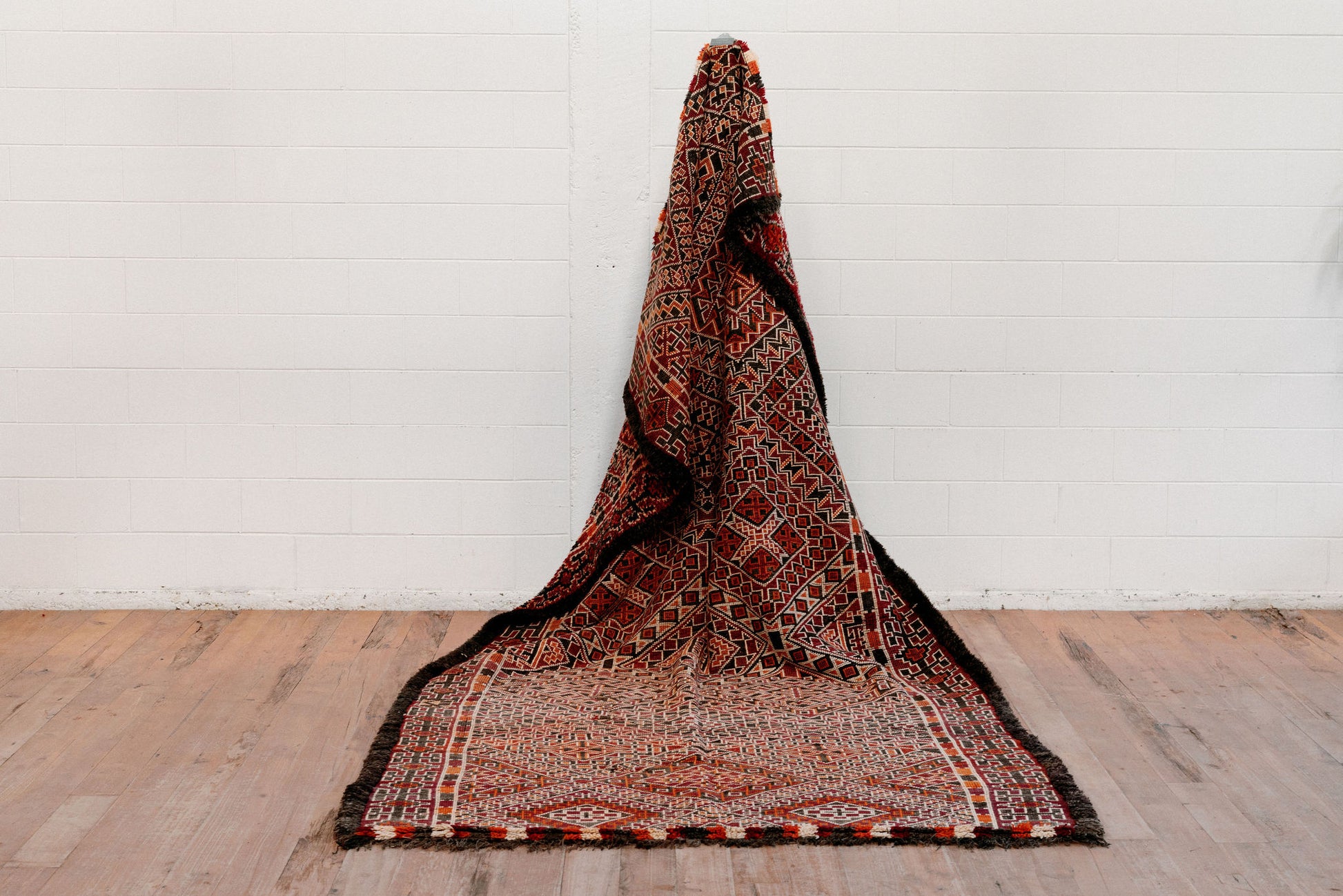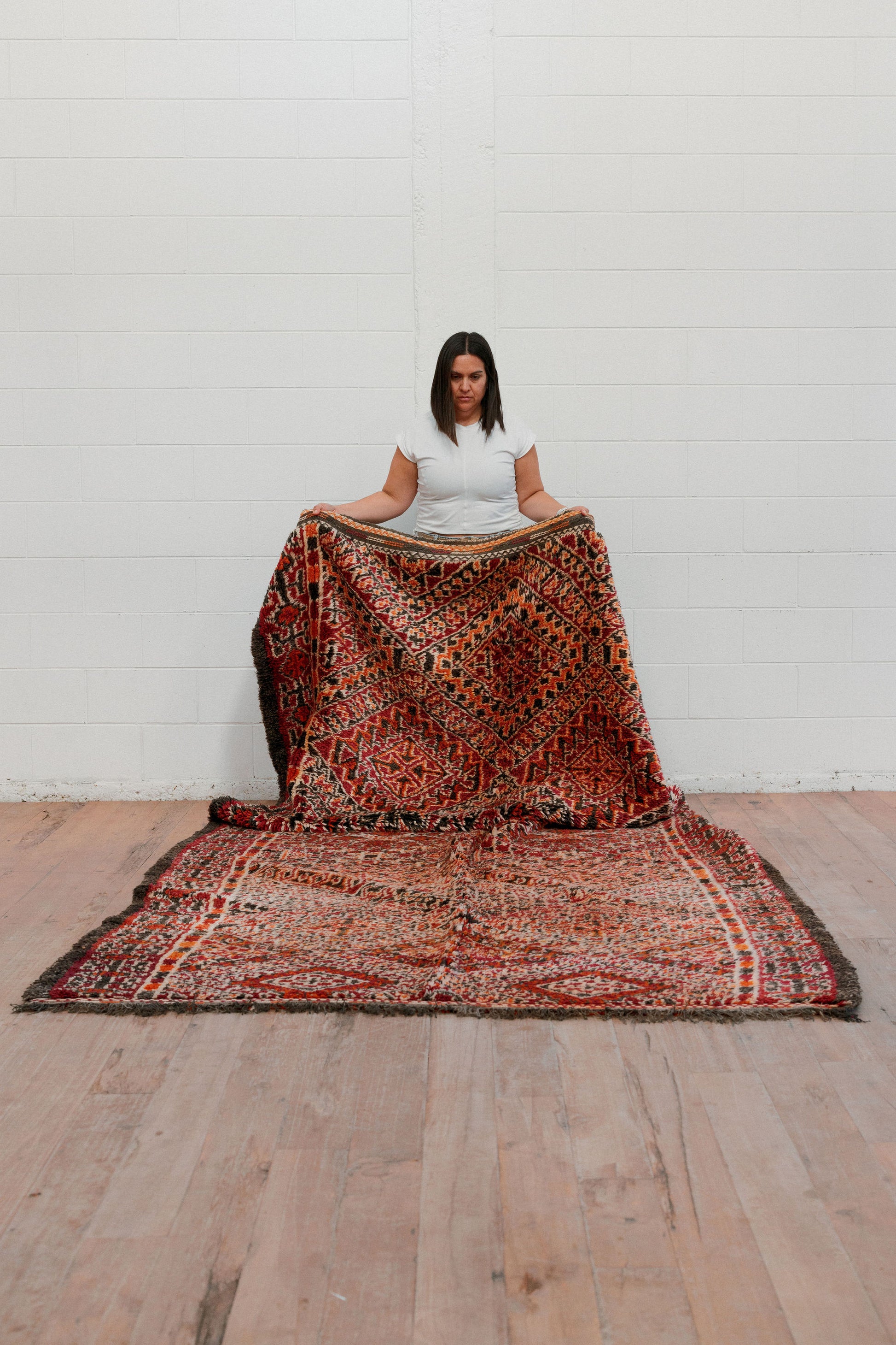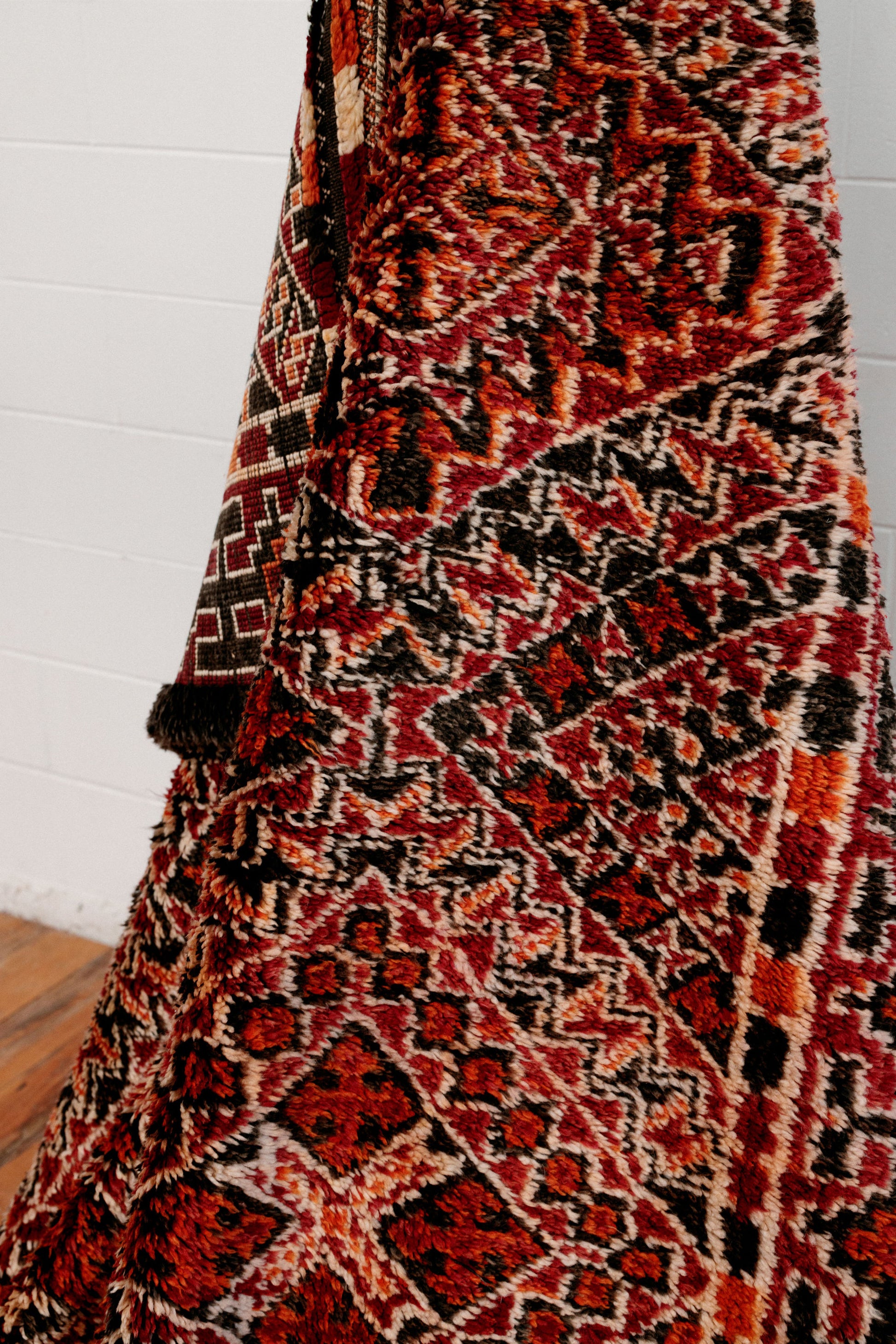 Named Rabie, meaning goddess, this vintage Moroccan Boujaad rug commands attention with its fierce beauty and timeless craftsmanship. Woven by hand, it features a rich cherry red base, vibrant orange tones — both soft and strong — and bold black accents, all brought to life through traditional geometric patterns. A short tassel fringe completes the piece with authentic character. Rabie is more than a rug — it's a tribute to feminine strength, ancestral artistry, and the bold beauty of Moroccan heritage.