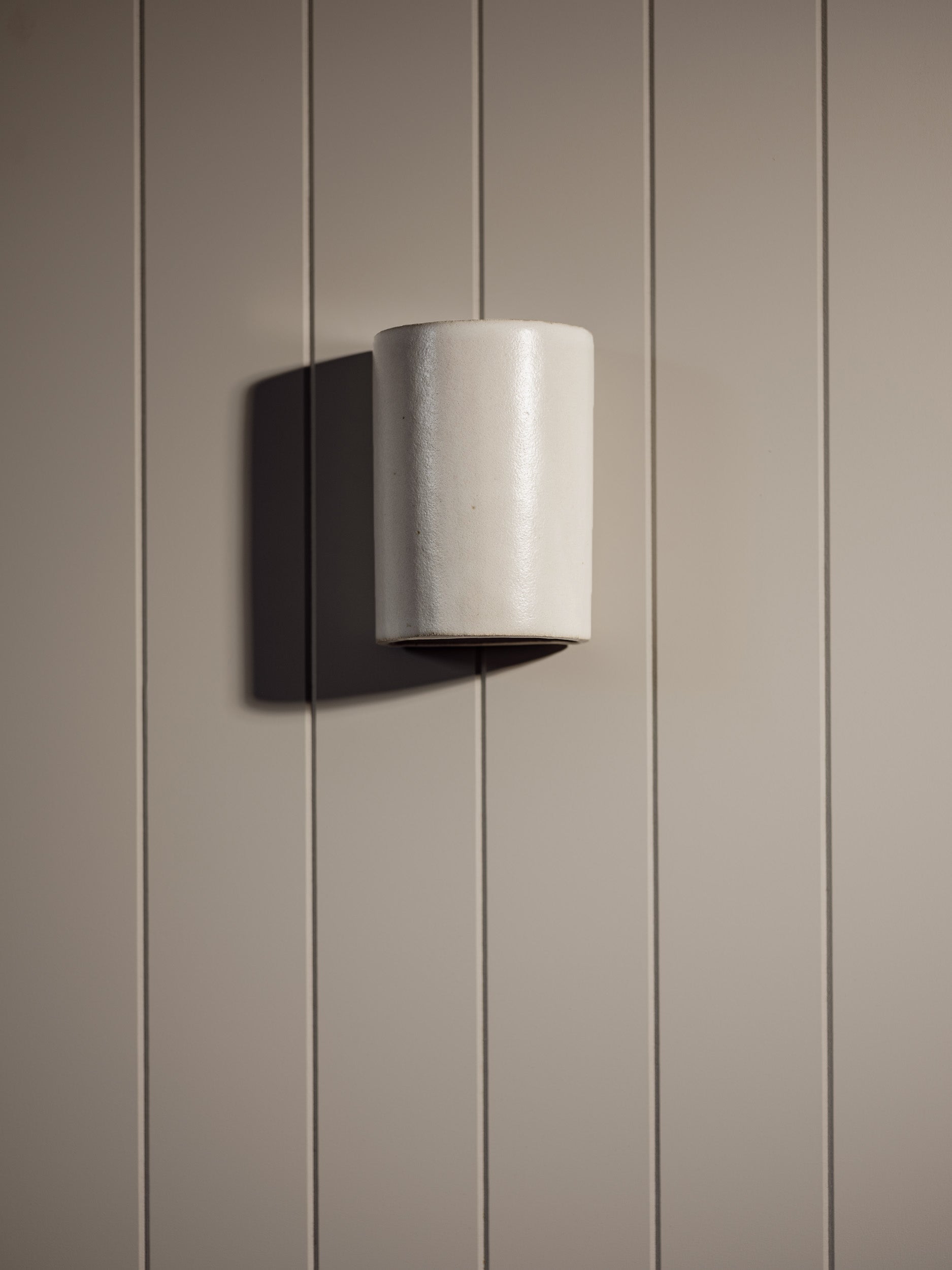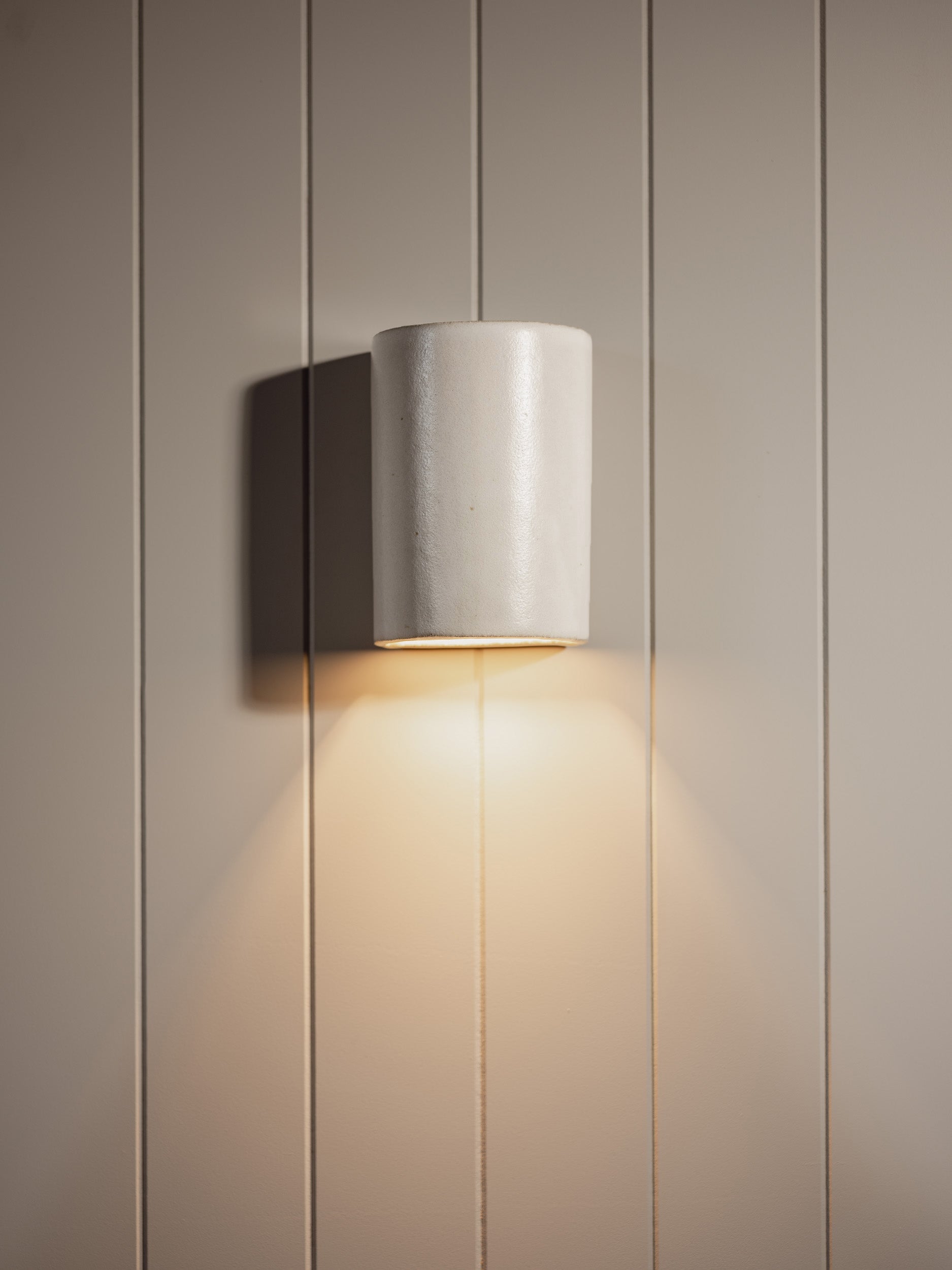 Add a touch of simple elegance and charm to your space with this unique, Tasmanian handmade ceramic wall light. It offers a subtle yet dynamic down light and eye-catching silhouette. The smooth ceramic is hand-dipped in an eggshell white low sheen glaze and fired twice at high temperatures for strength and durability. The custom-made back plate ensures a tight fit to any wall finish. To maintain consistency whilst preserving the handmade qualities, Dawn Short is slip cast into a mould. With a closed ceramic top, suitable for exterior installation.