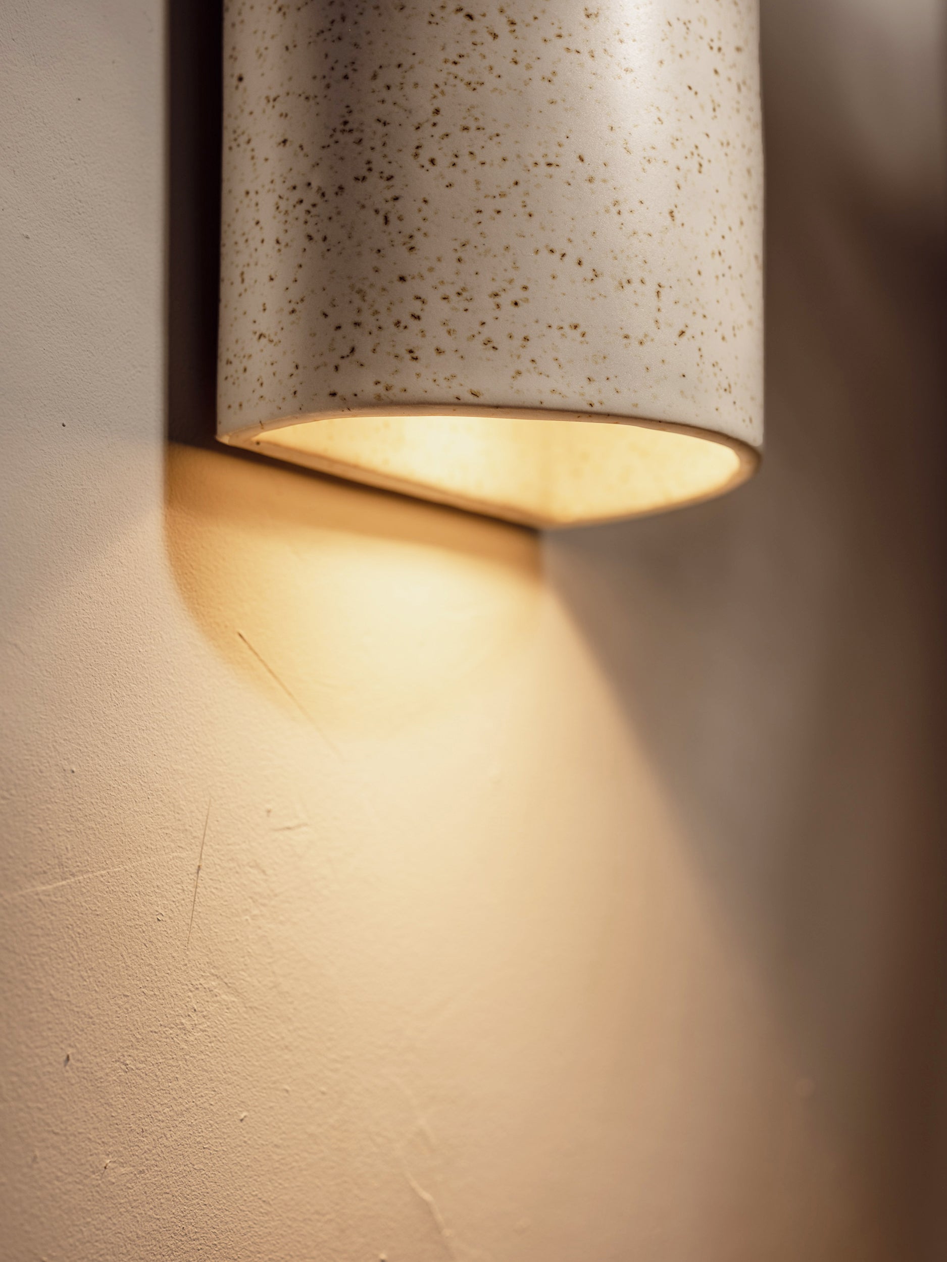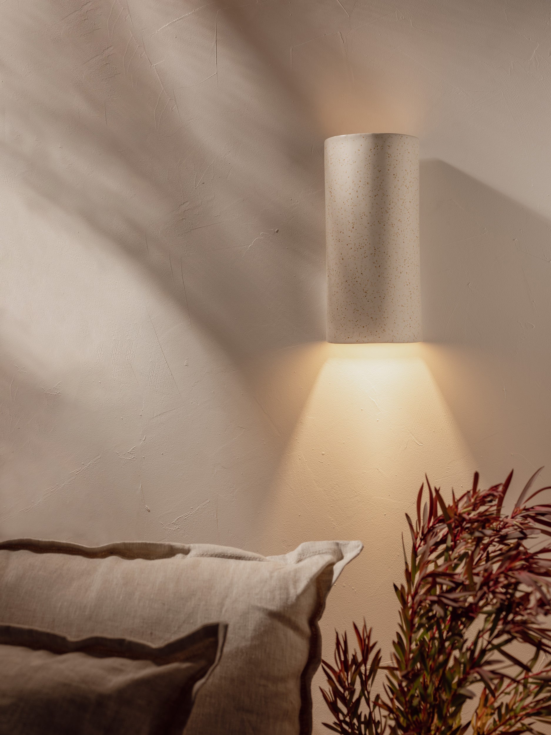 Bring a touch of sunshine to your space with Freckles, a unique ceramic wall light handmade in Tasmania, Australia. This charming light brings a touch of warmth and coziness to any room with its subtle yet dynamic downlight and eye-catching silhouette. Our makers have used a secret formula glaze technique, suspending iron oxide in a low sheen white glaze to create a delightful chemical reaction that gives Freckles its warm and freckled finish, just like it's been kissed by the sun! Mounted on a sleek, nearly invisible back plate, Freckles snuggles uptight to your wall. To maintain consistency whilst preserving the handmade qualities, Freckles is slip cast into a mould.