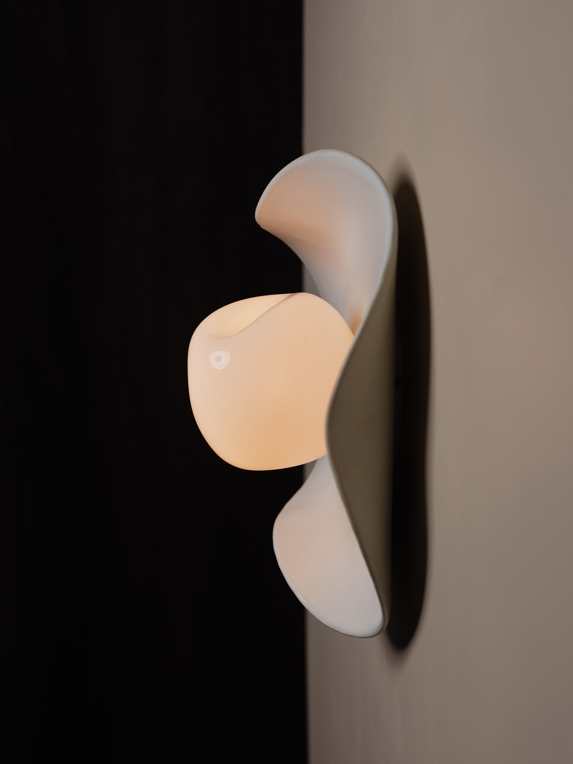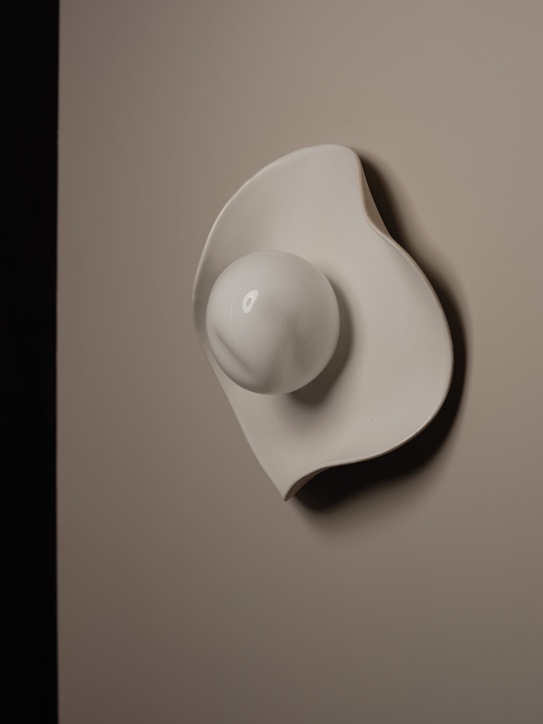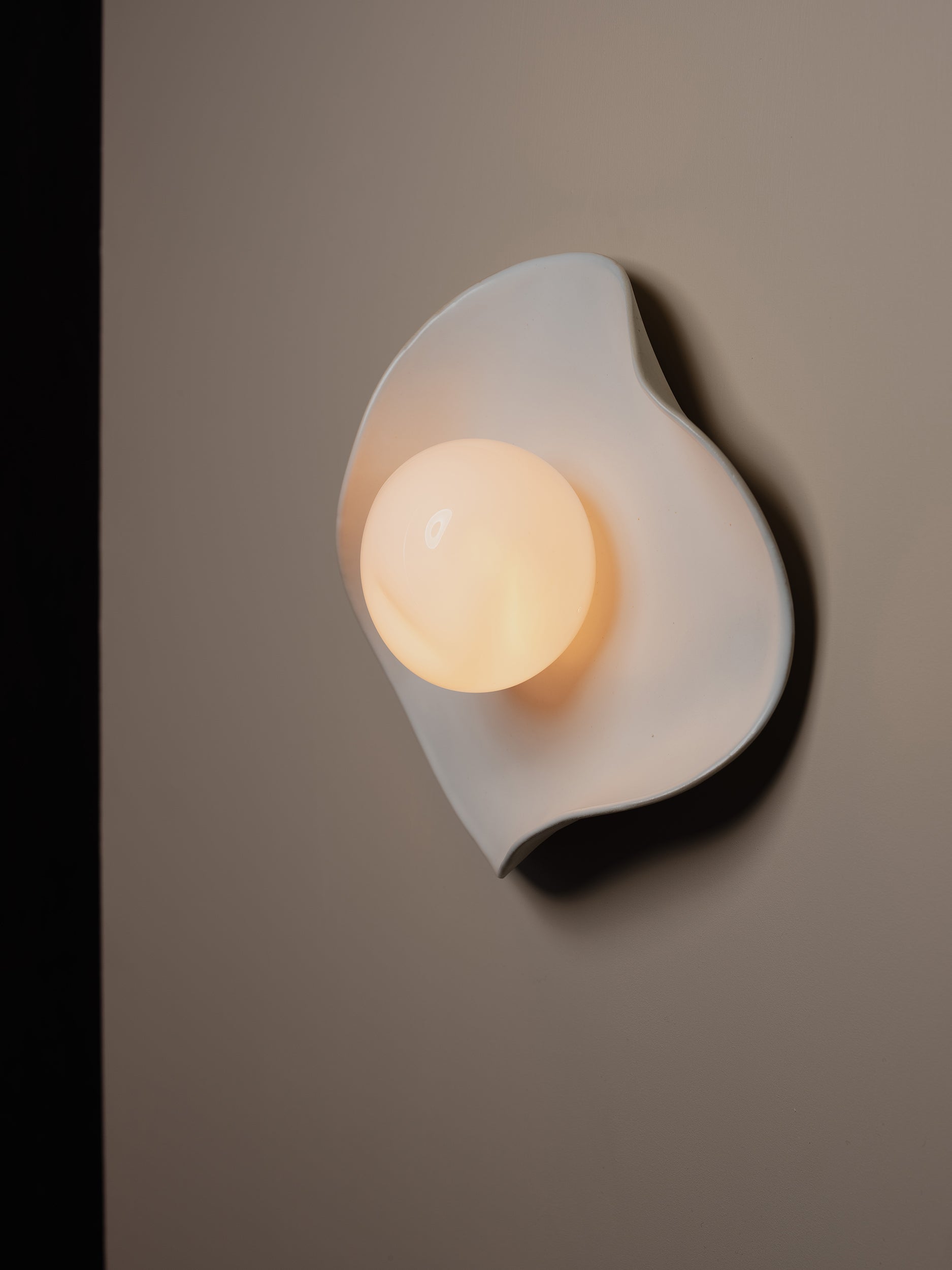 Puddle is a delicate wall light that features three slightly upturned edges, each are hand moulded and unique in their shape. This feature allows the ceramic disc to be pivoted by the installer, creating varying light reflections and dynamic shadows. With each shift in angle, the light transforms its surroundings, offering a captivating visual experience. The pearl like hand blown bulb celebrates unique bulges, pinches and bubbles, representing the delicate handmade touch each individual bulb goes through during creation. The ceramic disc is dipped in our signature white glaze with a raw clay back. Both components are threaded onto a custom white powder coated (nearly hidden) electrical backplate, housing a G9 LED globe. We can’t wait to see where you decide to install our Puddle wall light!