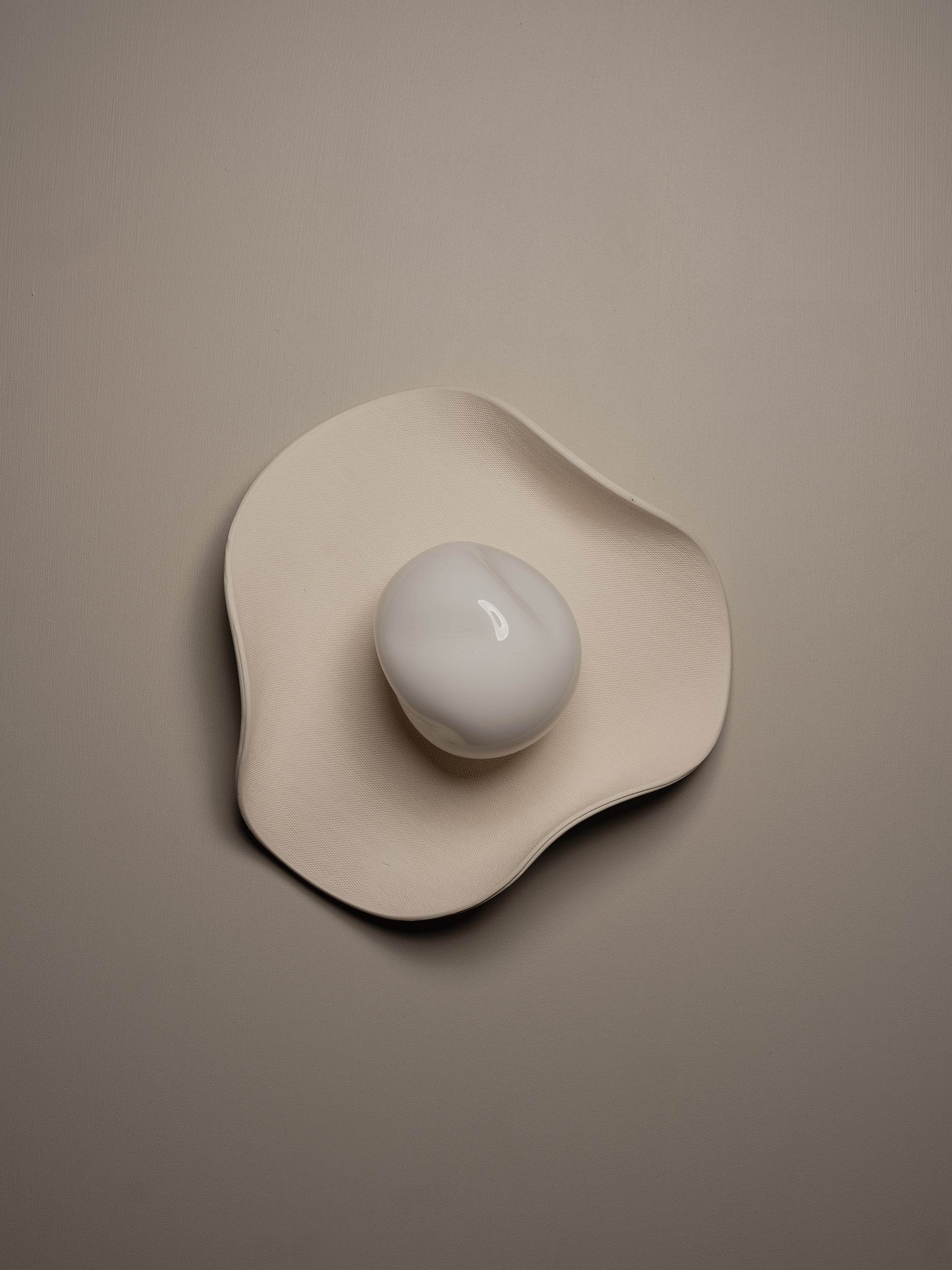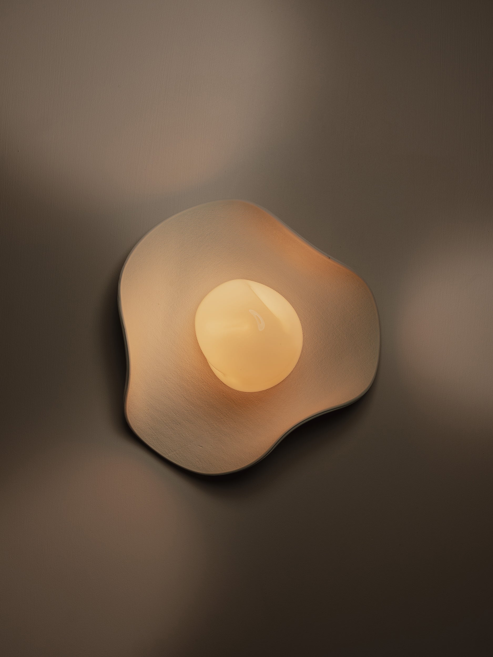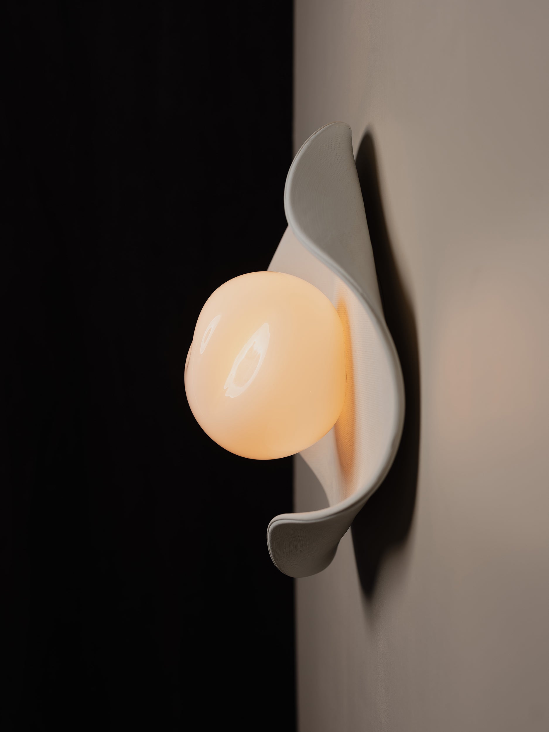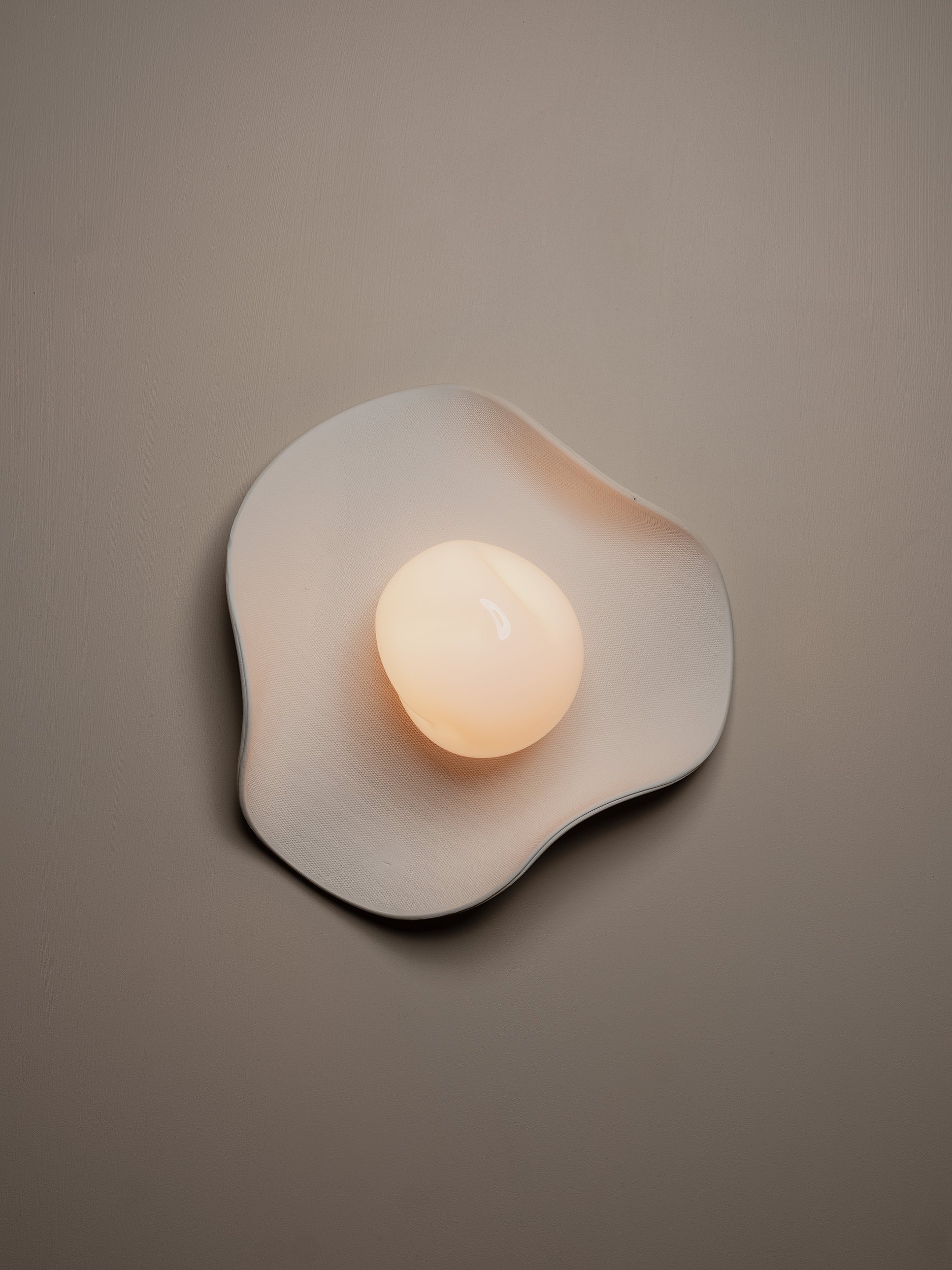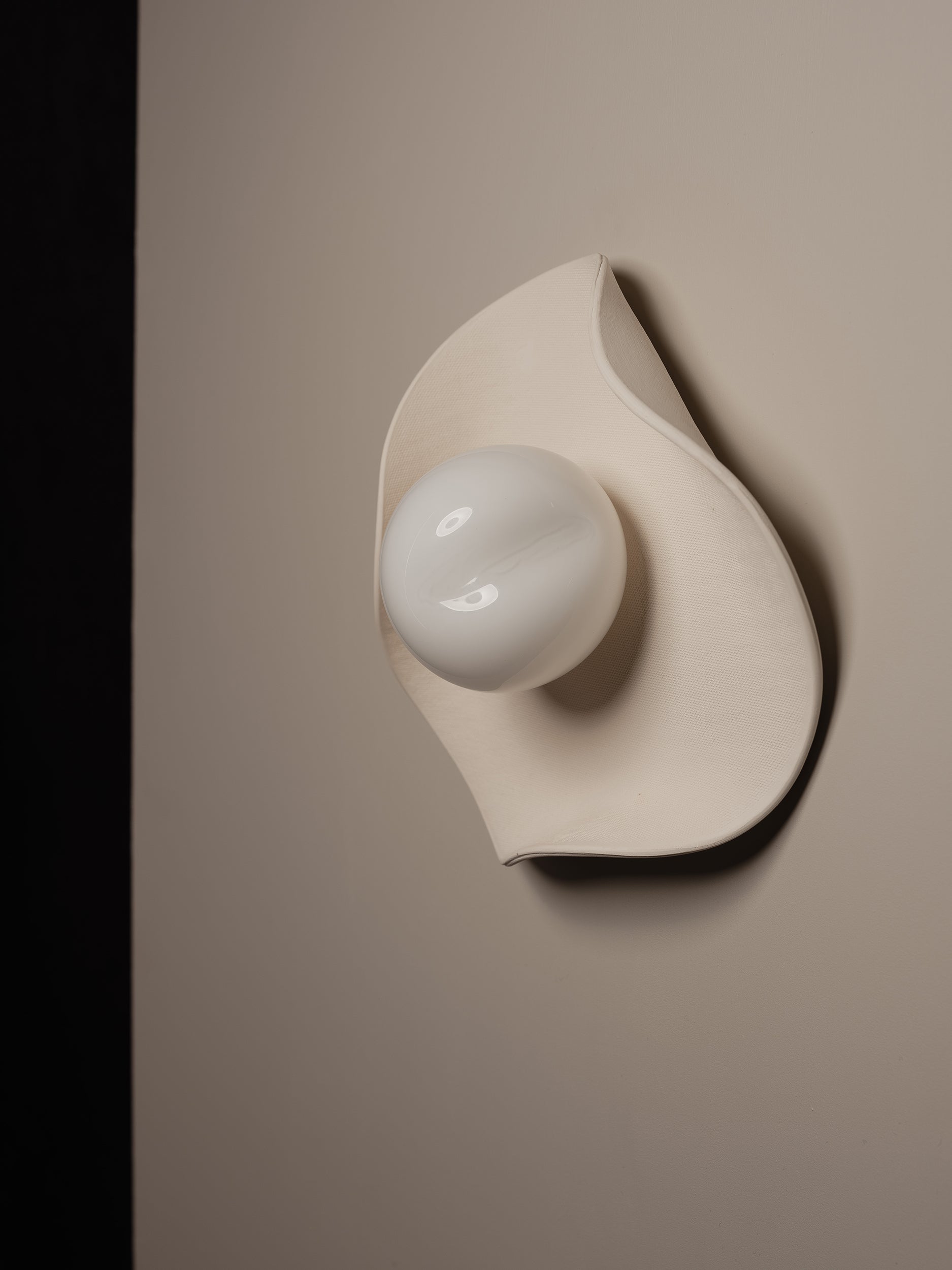 Puddle is a delicate wall light that features three slightly upturned edges, each are hand moulded and unique in their shape. This feature allows the ceramic disc to be pivoted by the installer, creating varying light reflections and dynamic shadows. With each shift in angle, the light transforms its surroundings, offering a captivating visual experience. The pearl like hand blown bulb celebrates unique bulges, pinches and bubbles, representing the delicate handmade touch each individual bulb goes through during creation. The ceramic disc is in We Ponder’s unglazed ‘stone’ finish, with a subtle pressed fabric texture that beautifully compliments its organic shape. Both components are threaded onto a custom white powder coated (nearly hidden) electrical backplate, housing a G9 LED globe. We can’t wait to see where you decide to install our Puddle wall light!