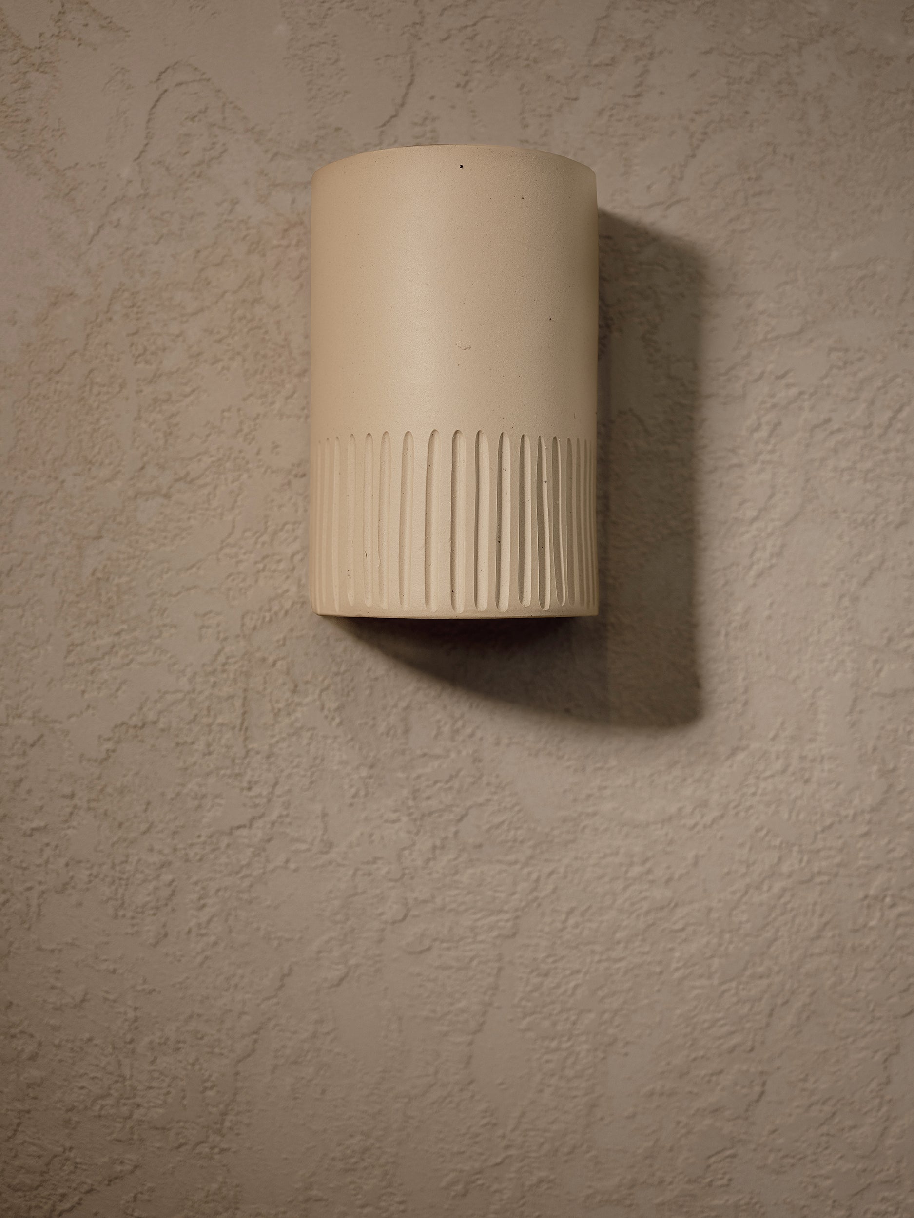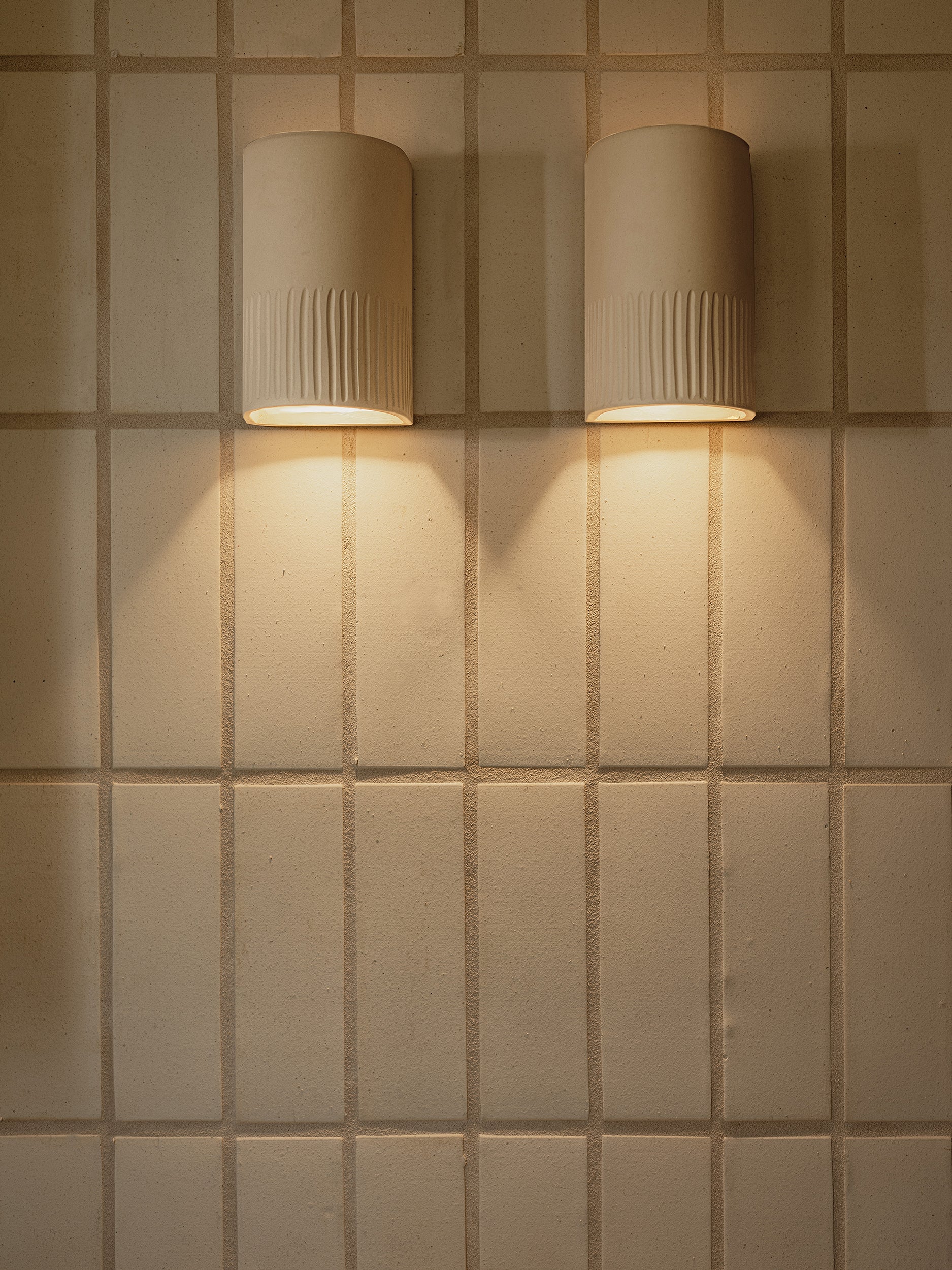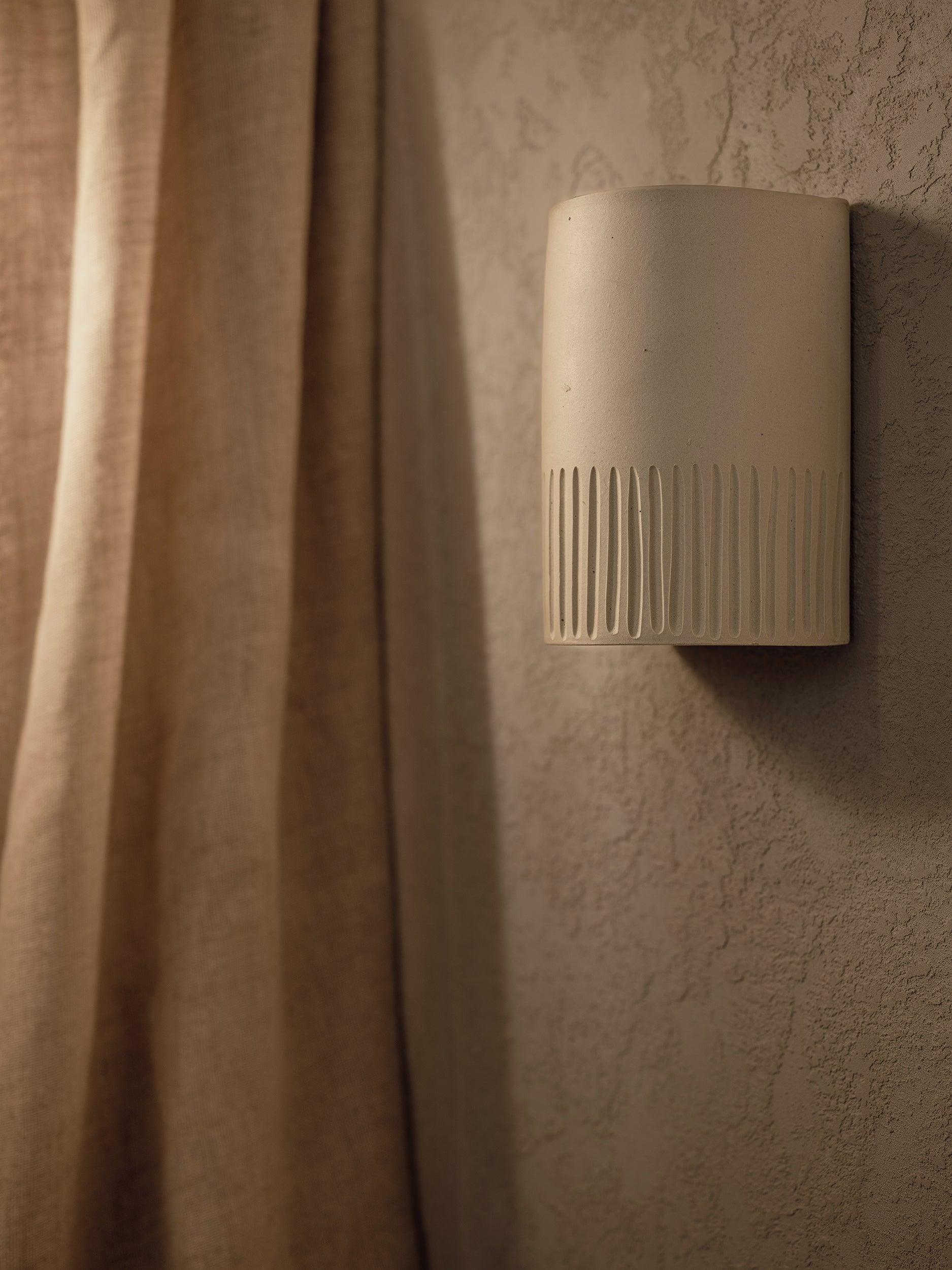 Introducing one of our newest editions to the We Ponder family, the Stone wall light; also known as our naked tanned Day. This meticulously handmade fixture brings warmth and ambiance, enhancing any interior with its soft yet dynamic downward light and compelling silhouette. Constructed from smooth clay, this piece is left unglazed and twice fired to achieve a seamless, sandy hue that emulated the appearance of natural stone. The lower third features a playful corduroy pattern, expertly carved by hand to add texture to your wall. With a custom back plate designed for near invisibility, this wall light stands out beautifully when added to white walls, or integrates seamlessly with a timber or travertine feature wall. To ensure consistency while celebrating its handmade characteristics, the Stone wall light is slip-cast into a mould.