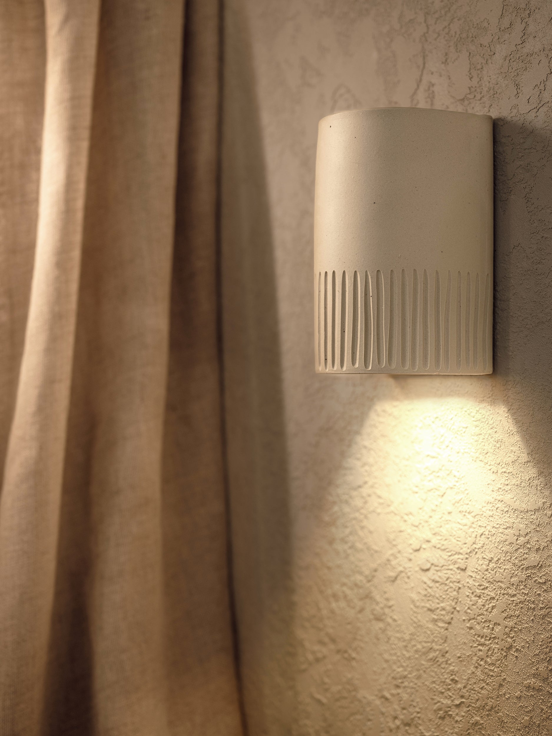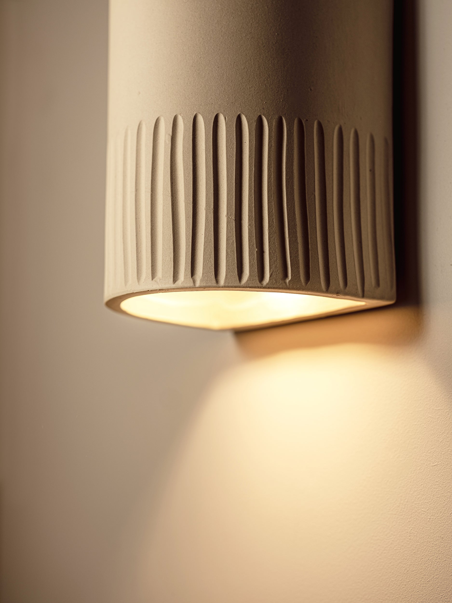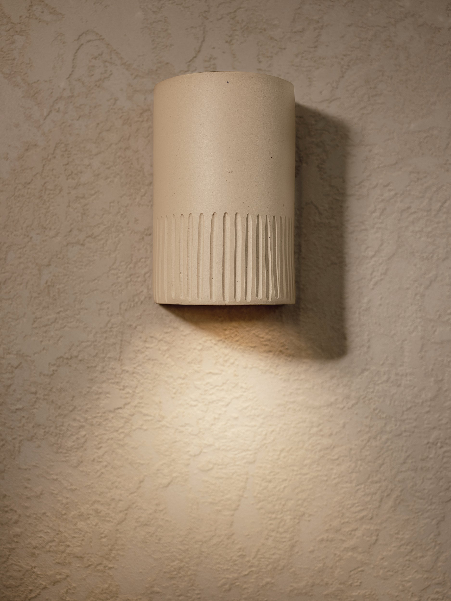 Introducing one of our newest editions to the We Ponder family, the Stone wall light; also known as our naked tanned Day. This meticulously handmade fixture brings warmth and ambiance, enhancing any interior with its soft yet dynamic downward light and compelling silhouette. Constructed from smooth clay, this piece is left unglazed and twice fired to achieve a seamless, sandy hue that emulated the appearance of natural stone. The lower third features a playful corduroy pattern, expertly carved by hand to add texture to your wall. With a custom back plate designed for near invisibility, this wall light stands out beautifully when added to white walls, or integrates seamlessly with a timber or travertine feature wall. To ensure consistency while celebrating its handmade characteristics, the Stone wall light is slip-cast into a mould.