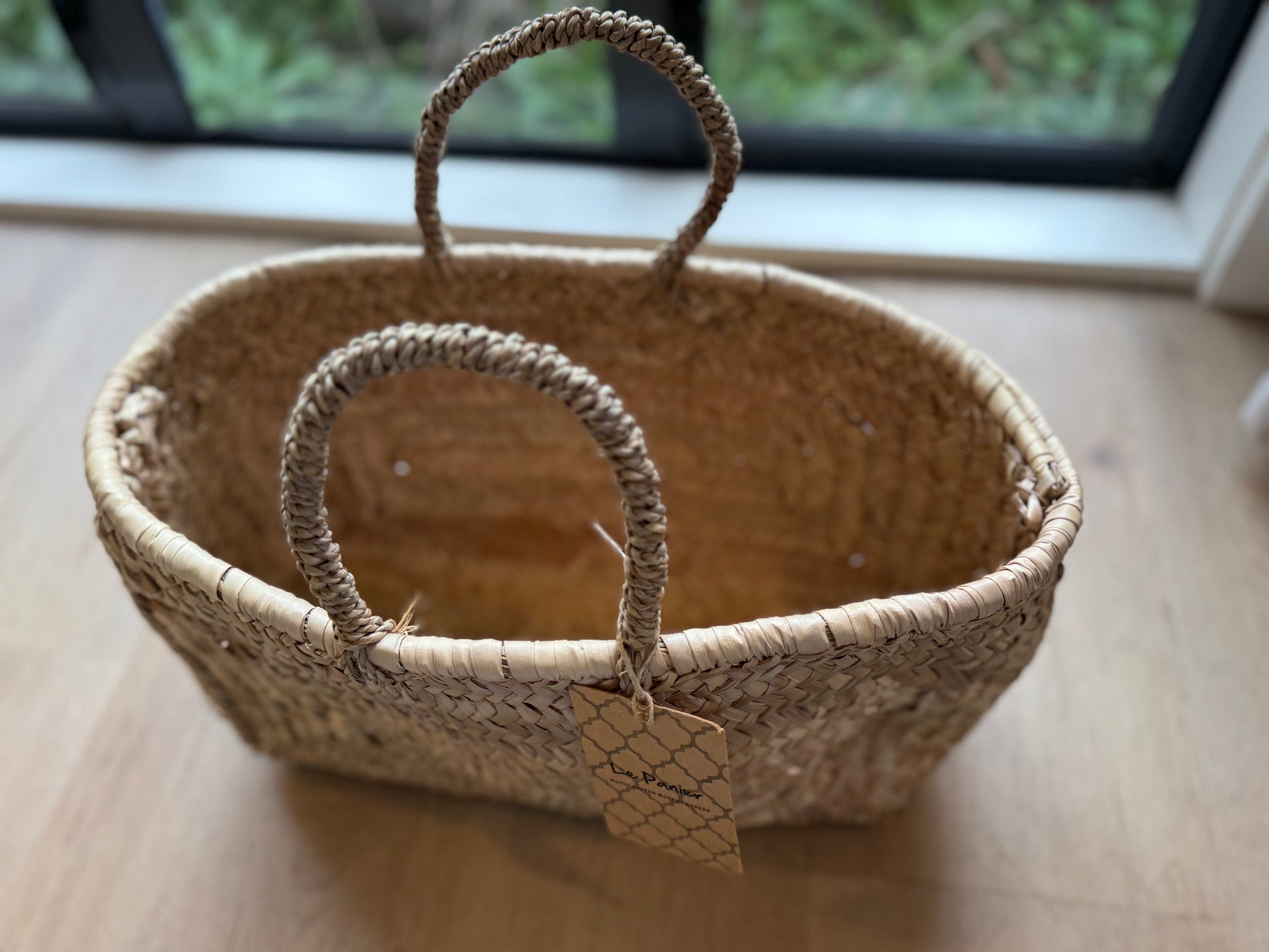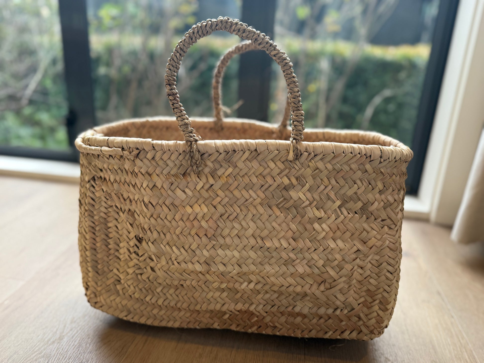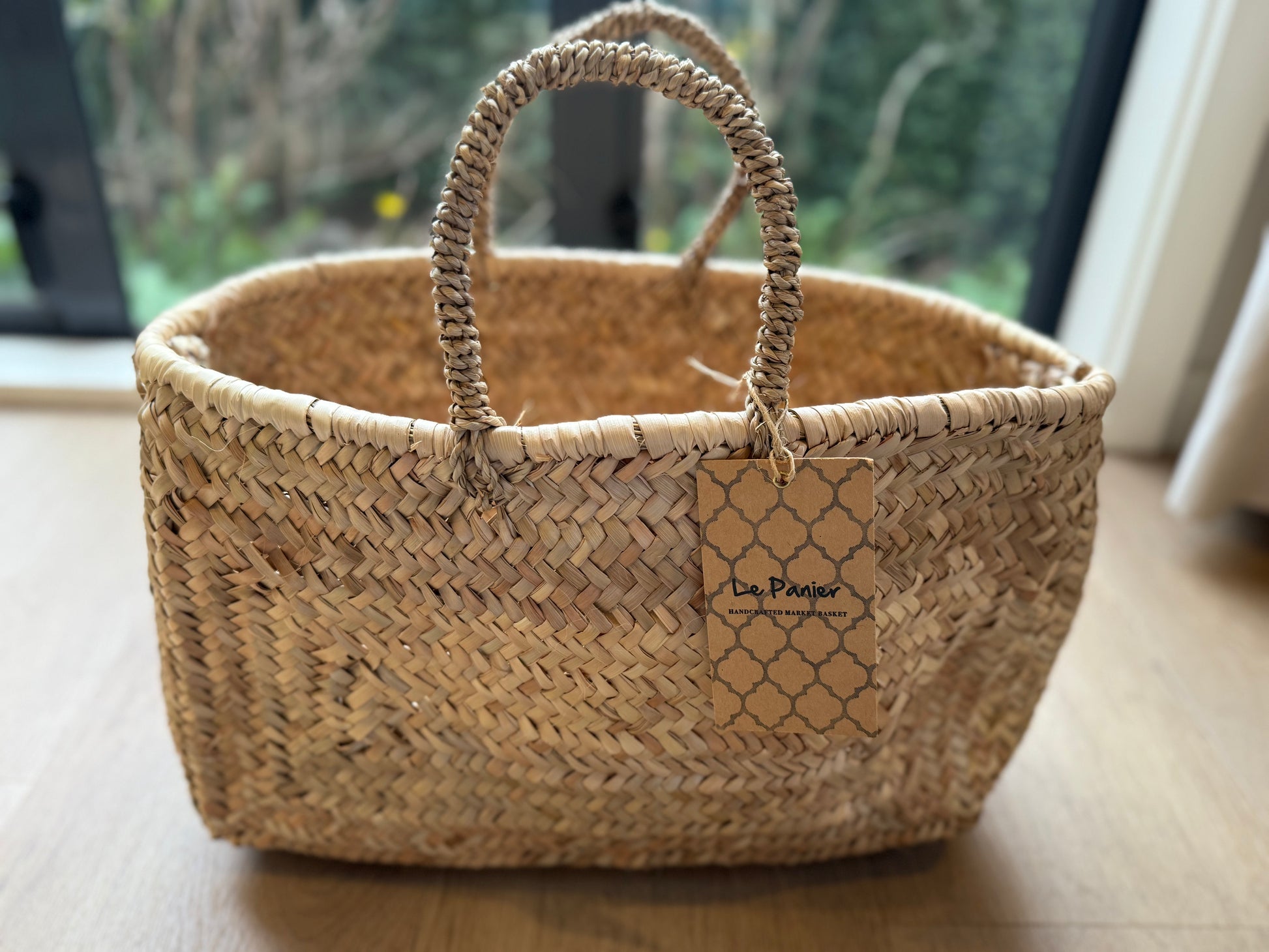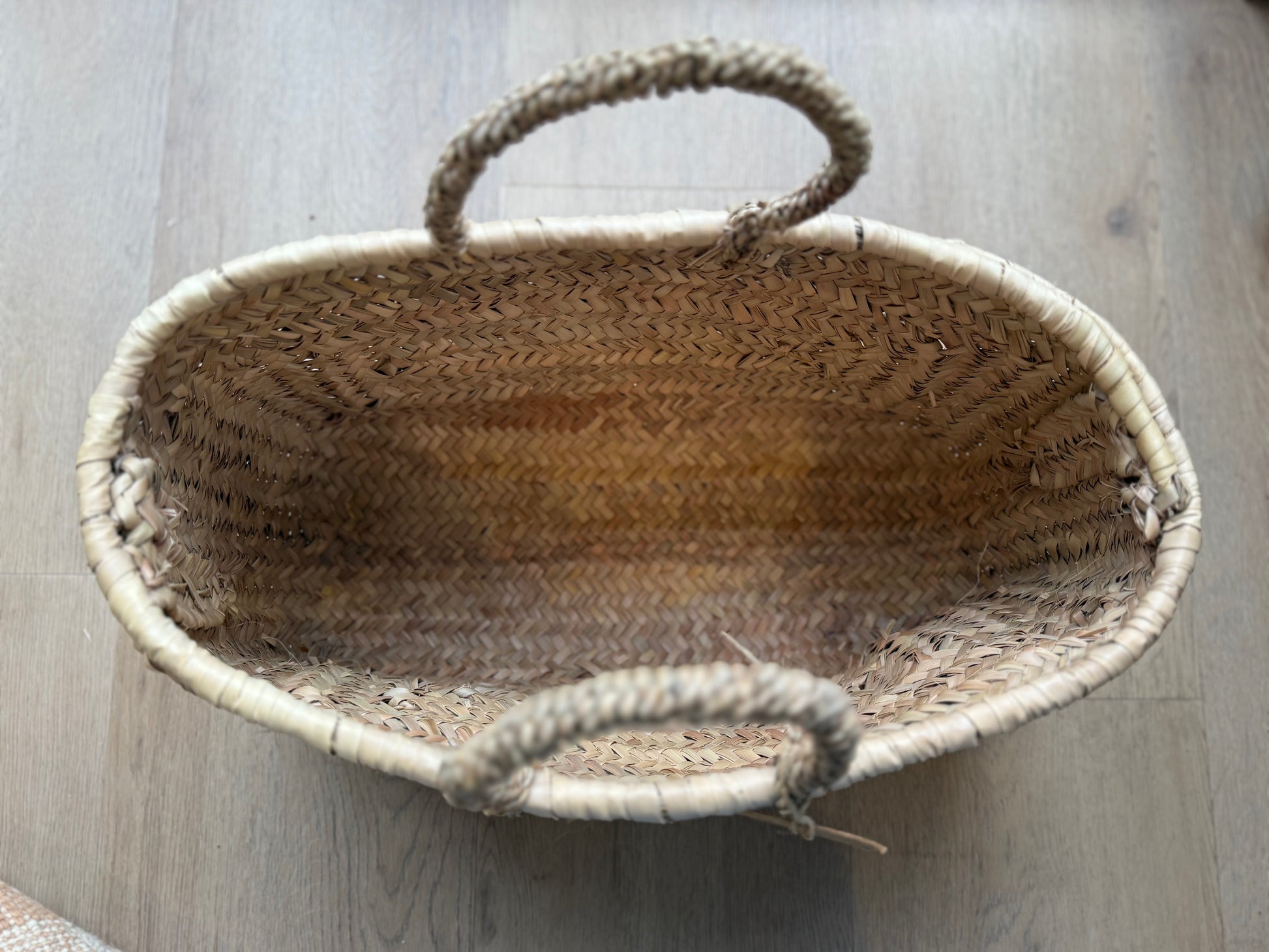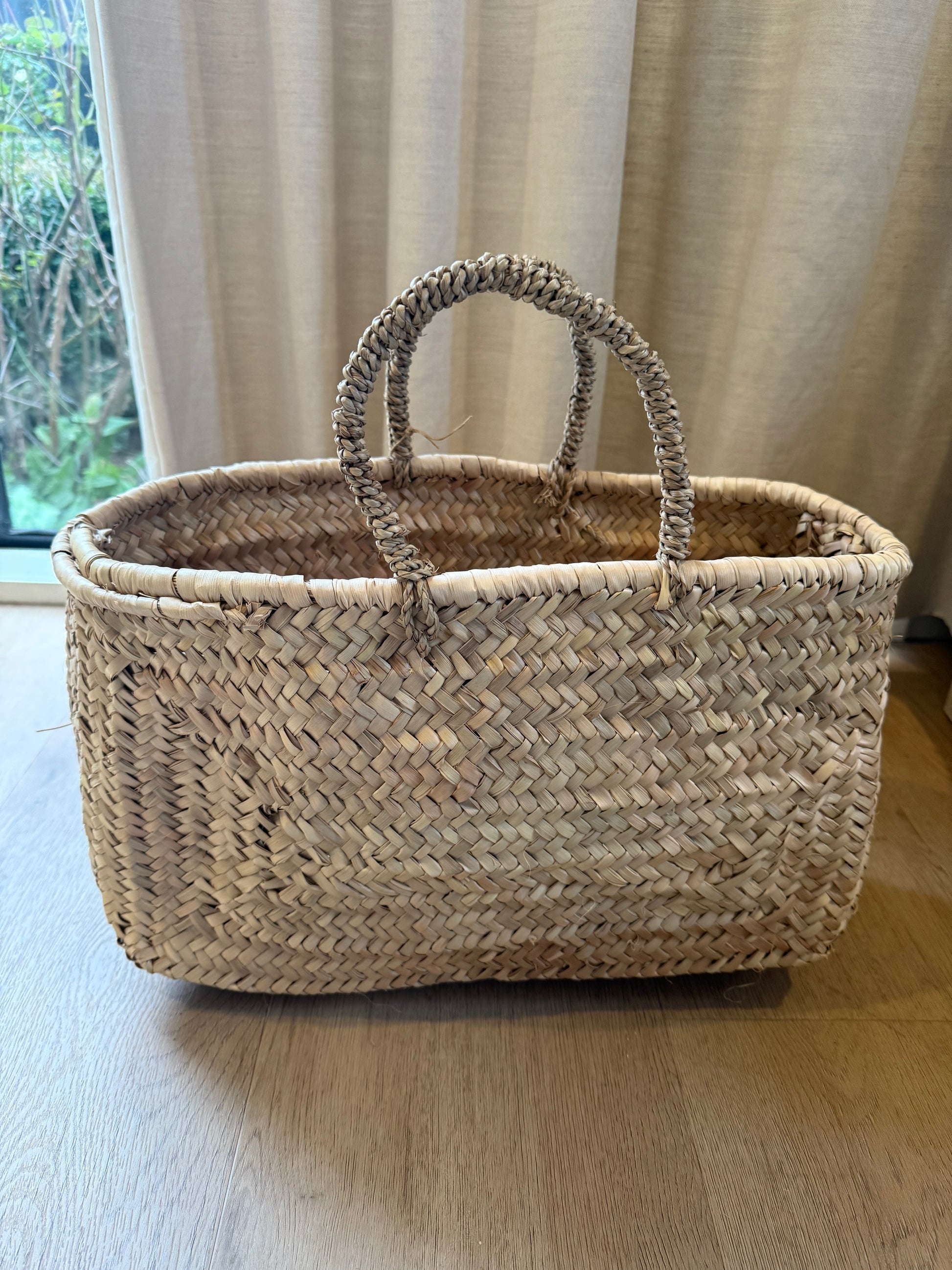 Hand woven in Morocco from fallen palm leaves with leather straps and sisal handle.